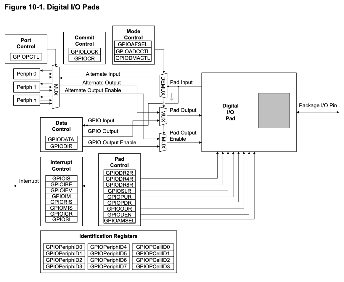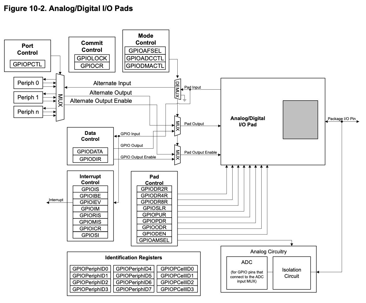 위의 그림에서 GPIODATA reg.와 GPIODIR reg.가 이에 해당된다. 이들 register들은 GPIO의 작동 mode를 SW적으로 설정할 수 있게 한다. GPIODIR reg.의 경우에는 input과 output을 설정할 때 사용되며, GPIODATA reg.는 들어오는 데이터를 잡아두거나 나가는 데이터를 pad에 올리는 역할을 한다.