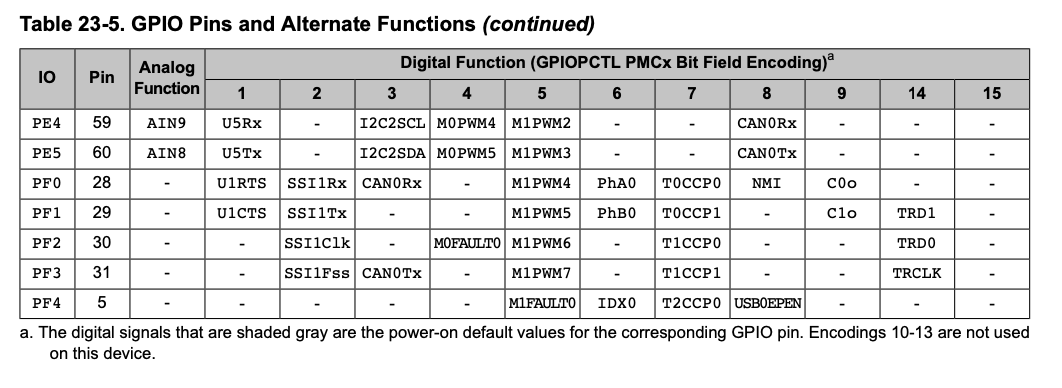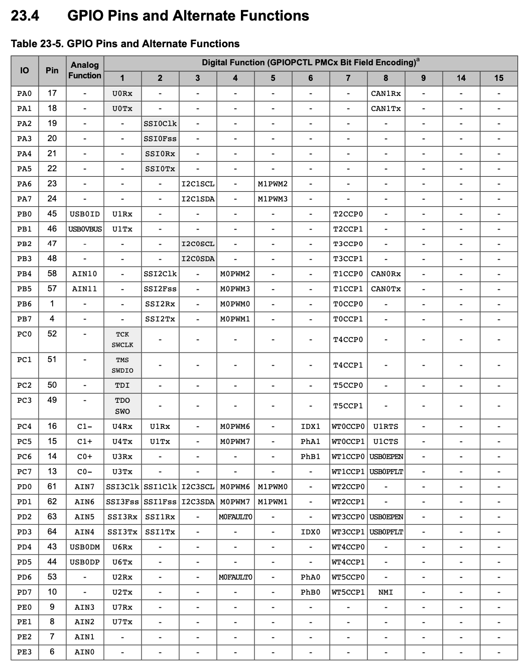 각각의 GPIO port는 위의 두 그림과 같이 동일한 물리적인 block으로 분리되어있다. 우리가 다루는 TM4C123GH6PM의 경우에는 GPIO port가 6개 존재하므로 이러한 물리적인 GPIO block이 6개 존재한다. 주의할 것은 모든 포트의 핀들이 이것에 심어져있는 것이 아니라는 점인데, 어떤 핀들은 on-chip peripheral module들의 I/O signal 기능을 한다. 예를들어 GPIO 핀이 alternate HW function으로 사용되는 것은 아래의 표에서 찾아볼 수 있다.