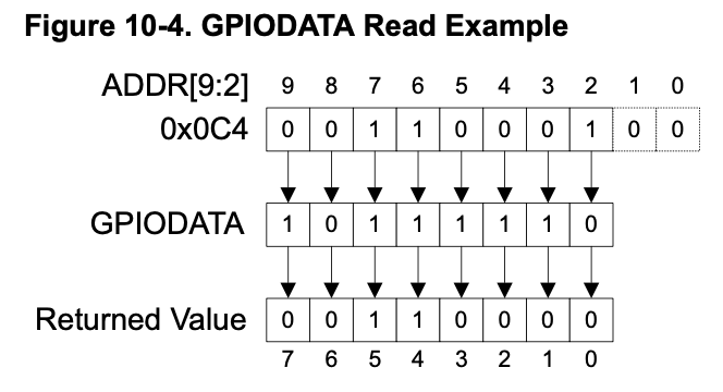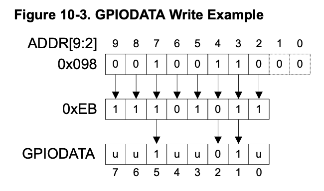 SW의 효율성을 위하여 각각의 포트는 GPIODATA reg.의 각각의 bit들을 address BUS의 [9:2]bit들을 mask로 이용함으로써 수정하는 것을 허용한다. 이러한 방식으로 SW driver는 한번의 instruction에 각각의 GPIO 핀들을 다른 핀들의 상태에 영향을 주지 않고 수정할 수 있다.
