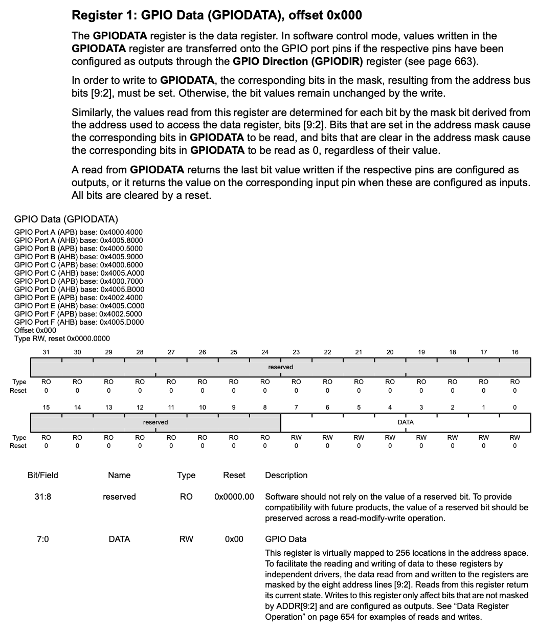 앞서 얘기했듯이 GPIODIR reg.는 각 핀을 input으로 할 지, output으로 할 지 설정할 수 있는 reg.이다. 만약에 GPIODIR reg.의 한 bit가 '0'으로 되었을 때, 해당 핀은 input으로 설정되고 이에 상응하는 GPIODATA reg.의 bit에 값이 저장된다. 반대로 '1'로 set되면 해당 핀이 output으로 설정되고 상응하는 GPIODATA reg. bit의 값은 해당 핀으로 나가게된다.