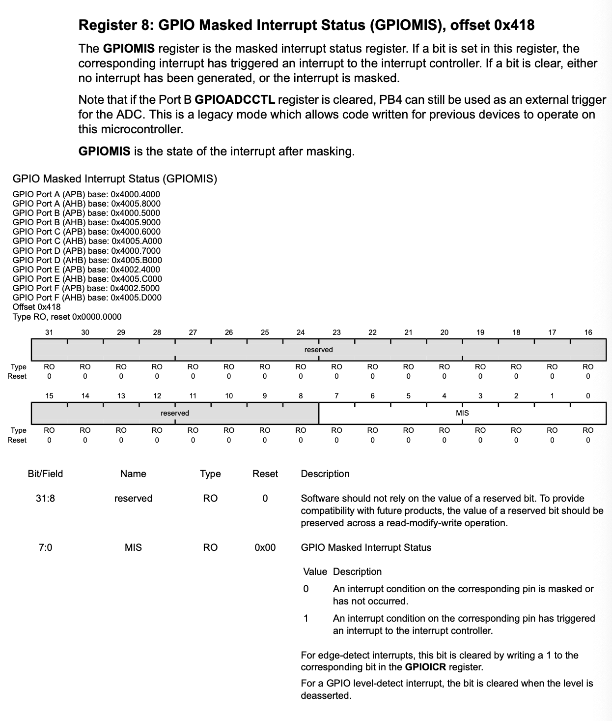 Interrupt condition이 발생했을 때, interrupt signal의 상태는 GPIORIS와 GPIOMIS 두 곳에서 확인이 가능하다. 이름이 암시하는 바와 같이 GPIOMIS의 경우에는 interrupt controller를 통과한 interrupt condition만을 보여준다. GPIORIS의 경우에는 interrupt condition의 input signal이 GPIO 핀에 들어온 것을 보여주지만, interrupt controller에 보내진 signal일 필요는 없다.