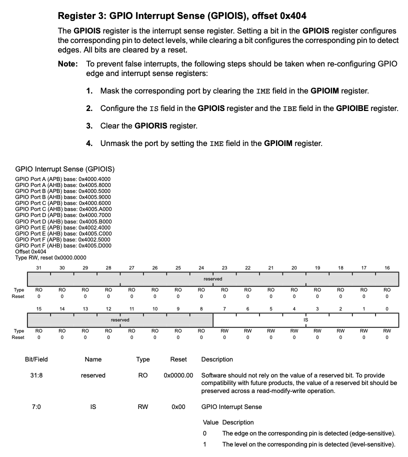 Interrupt control register들(GPIOIS, GPIOIBE, 혹은 GPIOIEV)을 프로그래밍할 때, interrupt들은 mask(GPIOIM을 clear함으로써)되어있어야 한다. Mask되어있지 않은 상태에서 위의 세 register에 값을 쓰게되면 불필요한 interrupt가 발생할 수 있다.