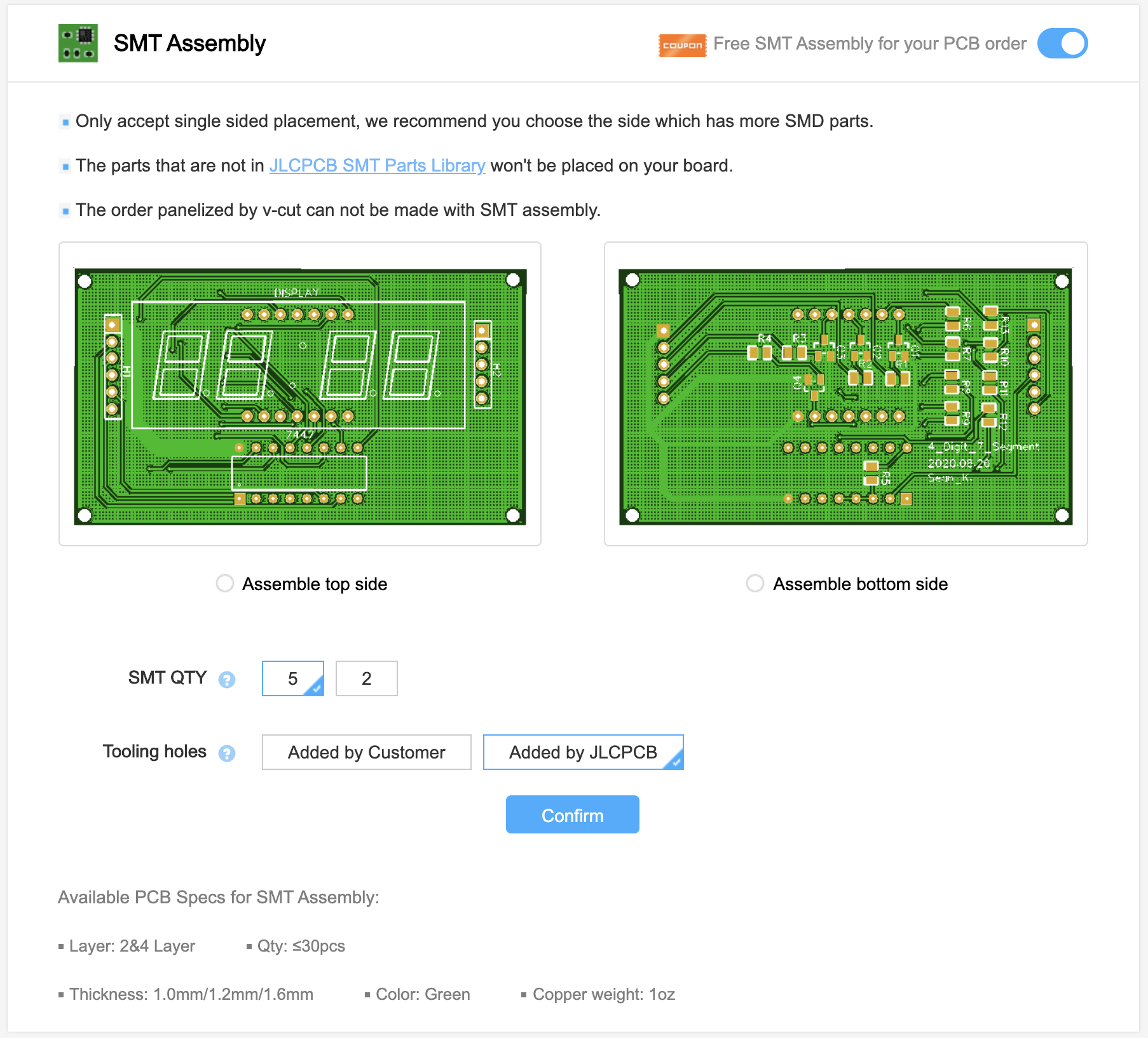 밑으로 내려가면 SMD 부품을 assemble 해주는 옵션을 선택할 수 있는 것이 보인다. 참고로 이를 위해서는 양면 중에서 한 쪽의 부품들만 가능하며 부품의 재고가 있을 때 가능하다. 그리고 PCB의 색을 초록색 이외로 하려면 assemble 서비스 이용이 불가하다.