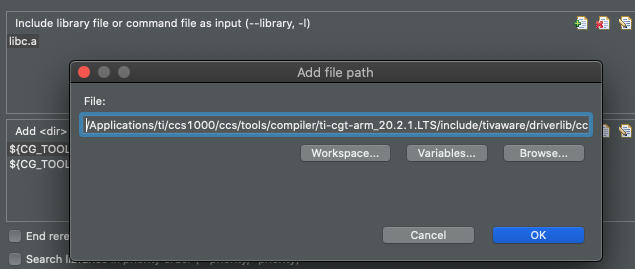 그 다음에 두번째 작업은 'properties->build->ARM linker->file search path->include library file or command file as input'에서 이루어진다. 여기에 다음 그림의 경로에 위치한 'driverlib.lib'를 추가해주면 된다.