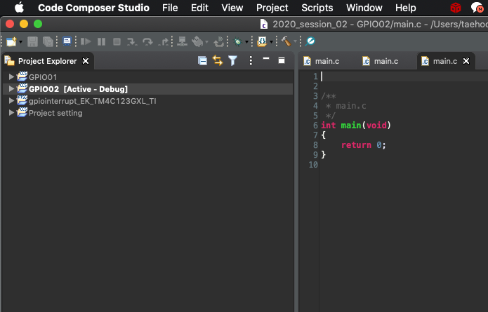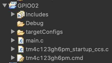 'Empty project with main.c'로 template을 정하고 finish를 누르면 다음과 같이 'Project Explorer'창에 프로젝트 폴더 안에 필요한 기본사항들이 담겨진다. 'Include'에는 '<stdint.h>' 나 '<inc/hw_memmap.h>'와 같은 이미 만들어져있는 header들이 담겨있다. 'Debug'에는 project build 이후에 생성되는 파일들이 담기는 곳으로 object file이나 .out file등이 담기게된다. 추가적으로 .out file은 'Binaries'라는 폴더가 build 이후에 생성되는데 이 안에도 담기게된다.
