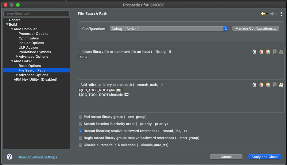 이제 총 3가지의 작업을 해주어야한다. 먼저 'TIVAWARE'을 include하여 필요한 header를 사용할 수 있게 하는 작업, Linker가 해당 library를 찾으러 갈 수 있게 하는 'file search path', 그리고 'connection'관련 option 설정이다. 기본적으로 3가지이고 추가적인 사항들(최적화 설정등)은 필요에 따라 설정하도록 하자.