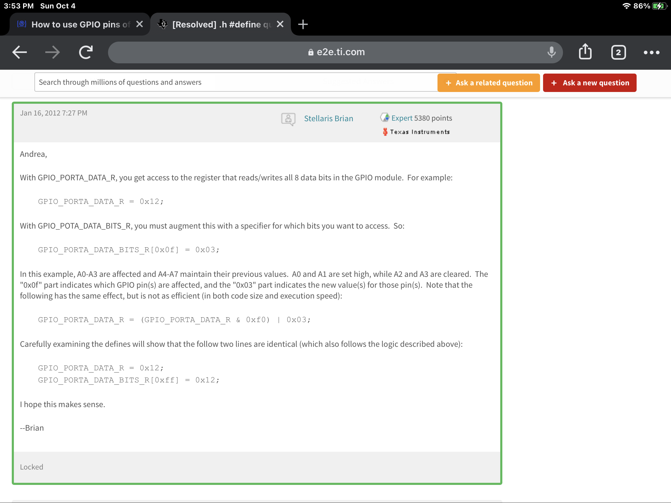 이 include file은 위에서는 그 일부분을 보여주는데 TM4C123GH6PM의 모든 register map을 define한 것이다. 위의 definition들 중에 '*'가 앞에 붙지 않은 것이 있다. 해당 definition은 'GPIO_PORTF_DATA_BITS_R'이다. 이를 사용하는 방식은 다음 사이트에서 볼 수 있다.