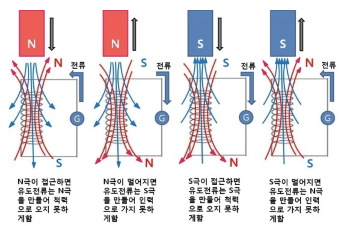 위의 그림을 보면 전류원이나 전압원이 없는 코일 도선에 자석을 가까이 하면서 자기력선속의 변화를 주면 이를 상쇄시키는 방향으로 유도전류가 발생한다. 이 전류를 EMF에 의해 생성된 전기에너지이다. 이를 설명하는 법칙은 'Lenz의 법칙'이다.