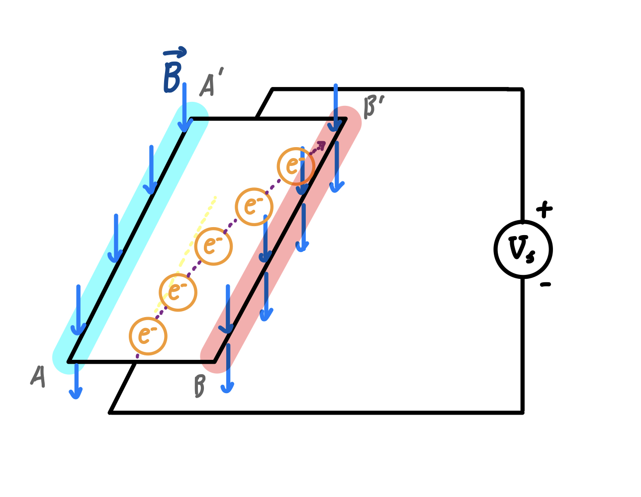 전도체 평판에 위와 같이 전압원에 의해 전류가 흐른다고 가정하자. 전류는 전형적으로 전하운반자들(전자, 정공, 이온)의 움직임을 내포한다. 위의 그림은 이 중 전자의 움직임을 전류의 흐름으로 보았다. 이때 평판에 수직하강방향으로 자기장이 걸리면 'Lorentz force'에 의해 전자움직임이 직선방향에서 오른쪽으로 치우친 방향으로 변화한다. 이에 의해 B-B' 에 전자가 쌓이고 평판에는 A-A'와 B-B' 사이에 전압차가 발생한다. 이 전압차를 활용한 것이 Hall-effect sensor이다.