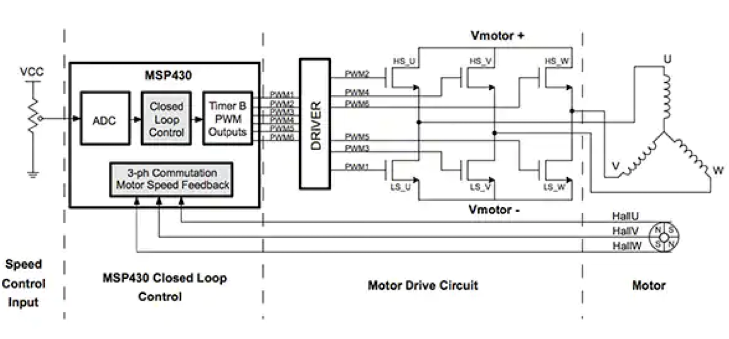 Sensor 부분에서 언급했듯 BLDC motor는 폐루프제어에 의해 작동한다. 위의 그림은 BLDC motor 폐루프제어 설계의 한 예시이다. Speed control input에서 설정된 아날로드 신호를 MSP430이 ADC를 이용하여 디지털 신호로 변환하고 해당 아날로그 값에 해당하는 BLDC motor의 속도를 만들기 위한 폐루프제어를 MSP430이 처리하는 system이다.