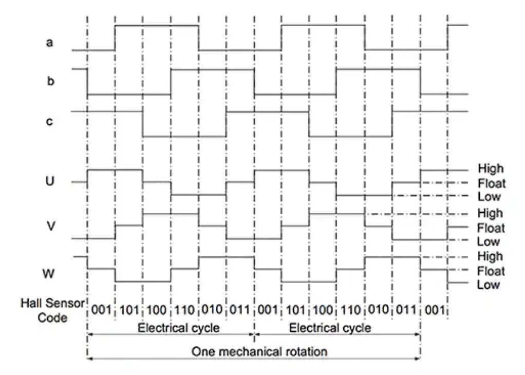 Sensor가 내장되어 있는 BLDC motor는 각각의 hall-effect sensor가 switch와 결합되어있다. 이 switch는 'Logic high(특정 자극에서)' 혹은 'Logic low(특정 자극의 반대에서)' 신호를 생성한다. Commutation sequence는 hall-effect sensor 나오는 logic signal들의 조합으로 결정된다. 다음 그림은 Hall-effect sensor의 부착위치를 나타내기 위한 그림(U상이 High, V상이 Low 그리고 W상이 Float일 때)과 60도 간격으로 설치된 hall-effect sensor(a,b,c)의 BLDC motor 반시계회전에 따른 타이밍 선도이다.