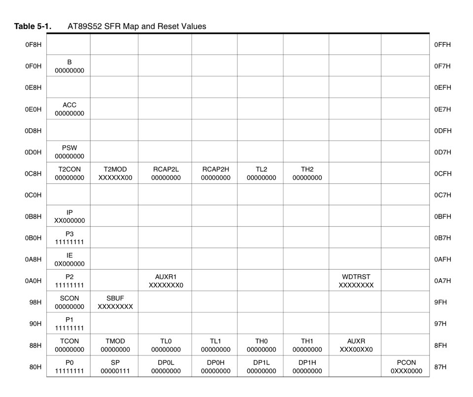 주의! 모든 주소가 SFR로 할당된 것은 아니다. 할당되지 않은 주소는 칩의 제조사와 칩넘버에 따라 아예 존재하지 않을 수 있다. 이렇게 SFR로 할당되지 않은 주소에 값을 읽는 것은 무작위 값을 불러오며 이 주소에 값을 쓸 경우에는 의도치 않은 동작을 야기할 수 있다.