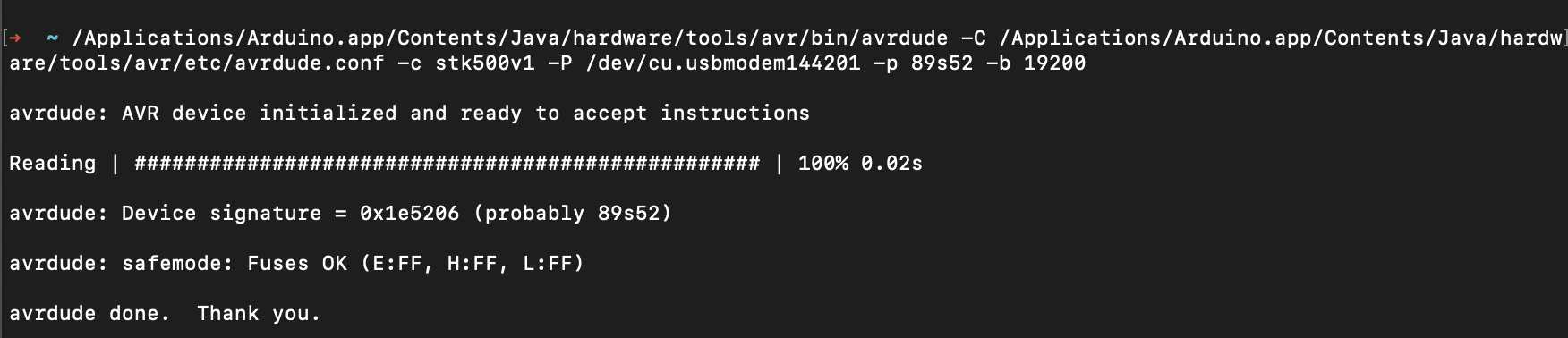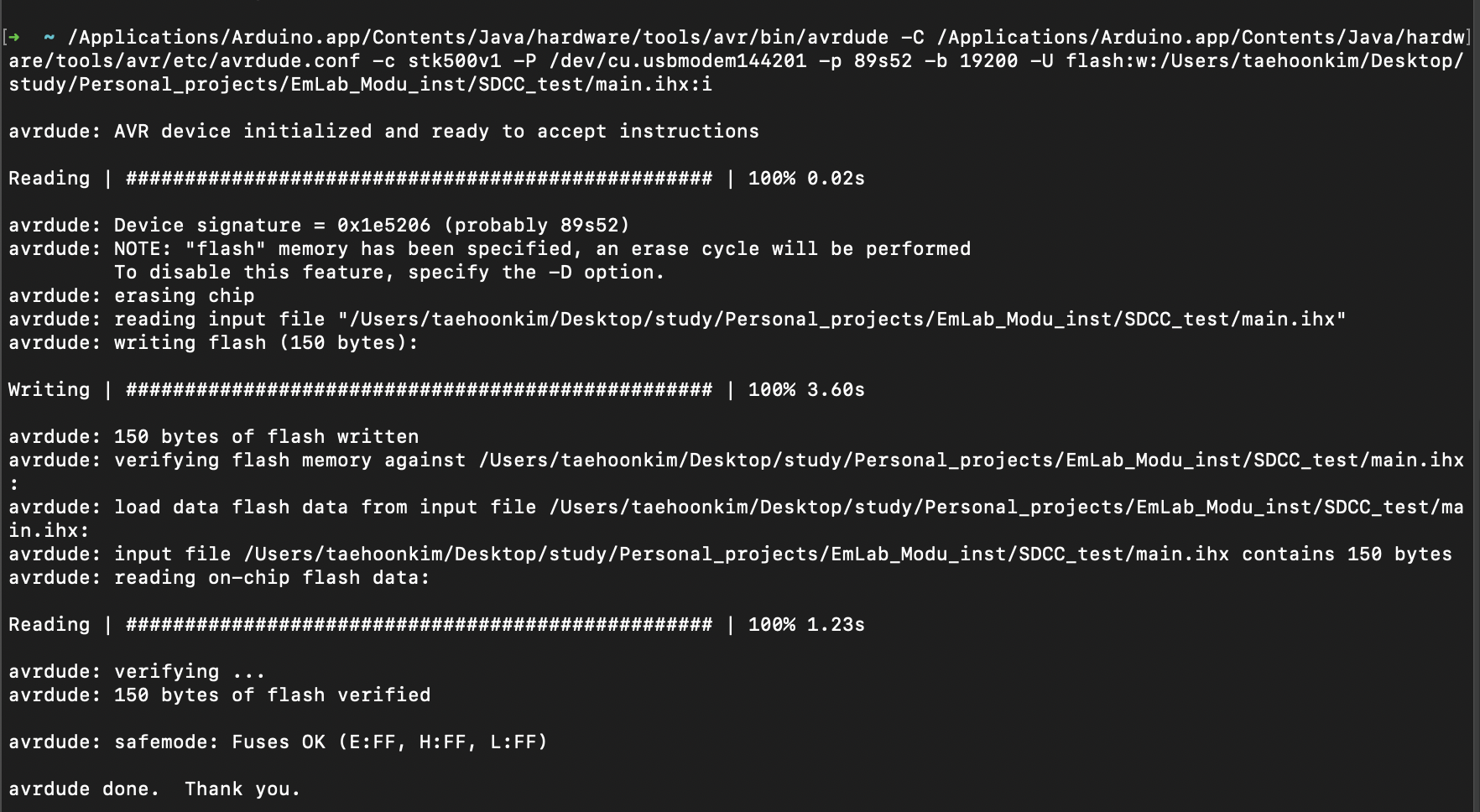 ➜ ~ /Applications/Arduino.app/Contents/Java/hardware/tools/avr/bin/avrdude -C /Applications/Arduino.app/Contents/Java/hardware/tools/avr/etc/avrdude.conf -c stk500v1 -P /dev/cu.usbmodem144201 -p 89s52 -b 19200 -U flash:w:/Users/taehoonkim/Desktop/study/Personal_projects/EmLab_Modu_inst/SDCC_test/main.ihx:i